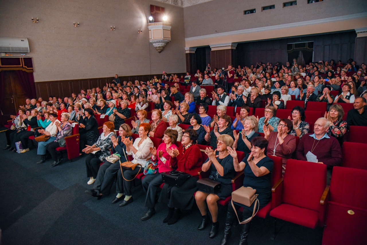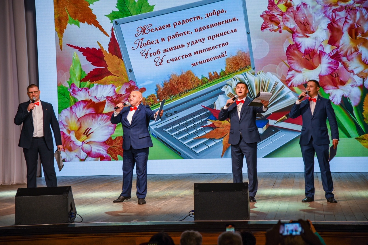 Праздничный концерт начался ярко: первыми на сцену вышли школьники с зажигательным танцем. После них оригинальный музыкальный подарок сделали мужчины — директора образовательных учреждений, исполнив песню о своих коллегах.