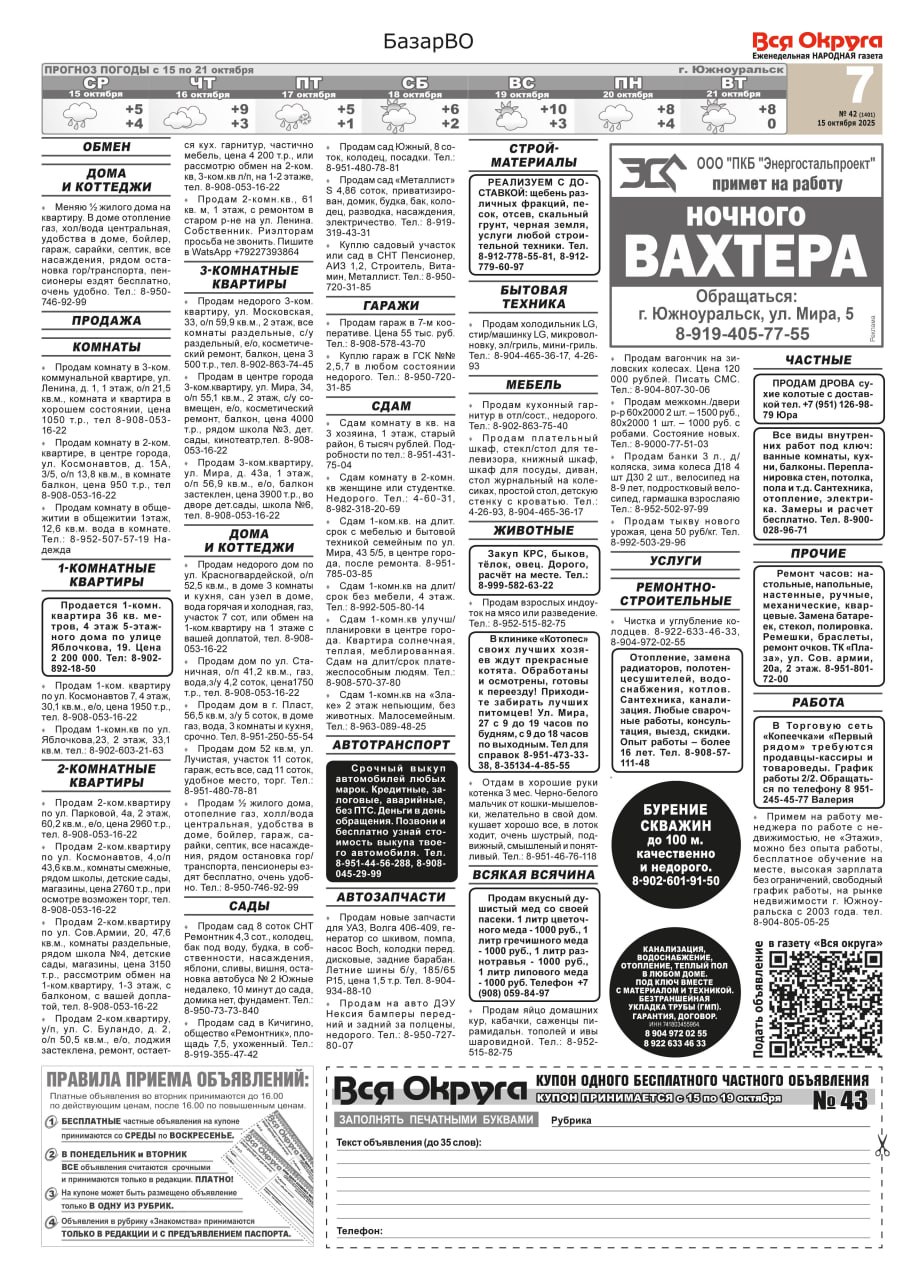 Друзья, публикуем объявления из газеты «Вся округа» от 15 октября. Кстати, в нашей группе в телеграм-канале можно не только почитать объявление, но и опубликовать свое частное объявление бесплатно.