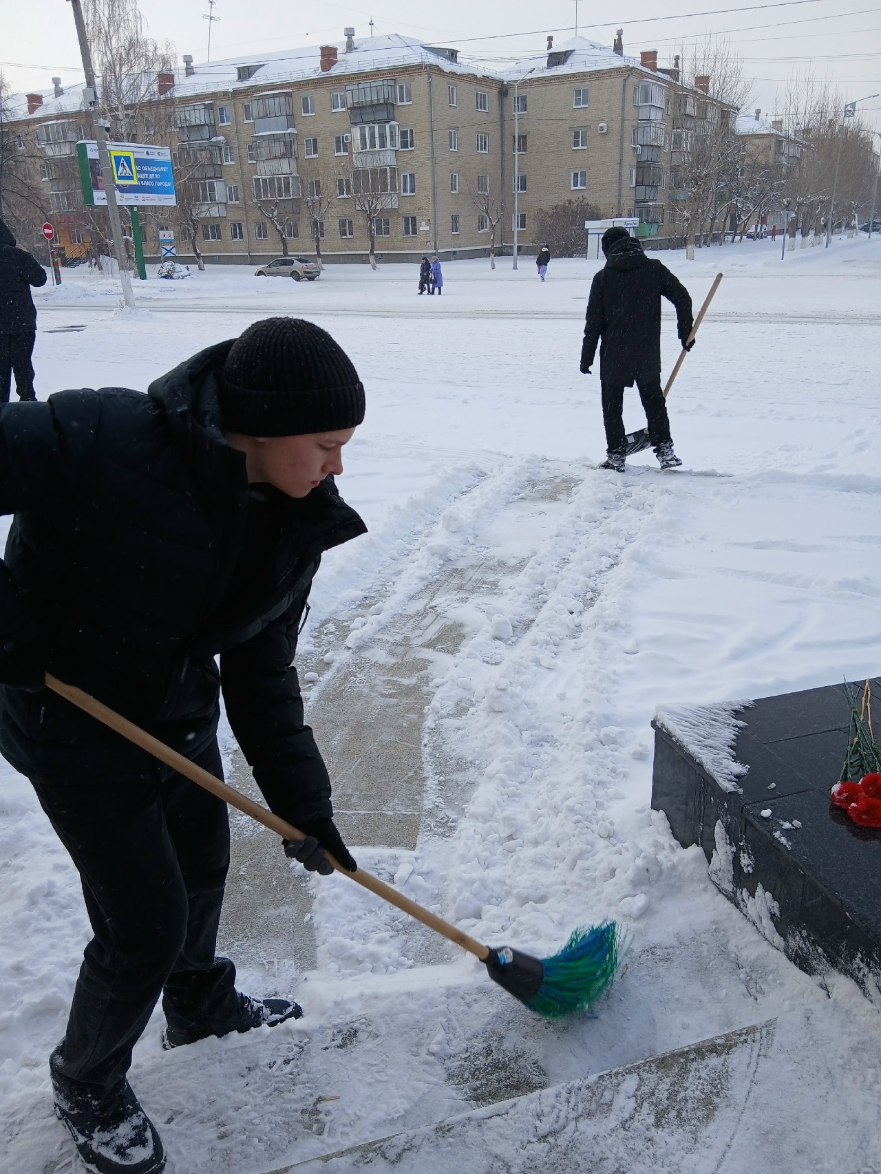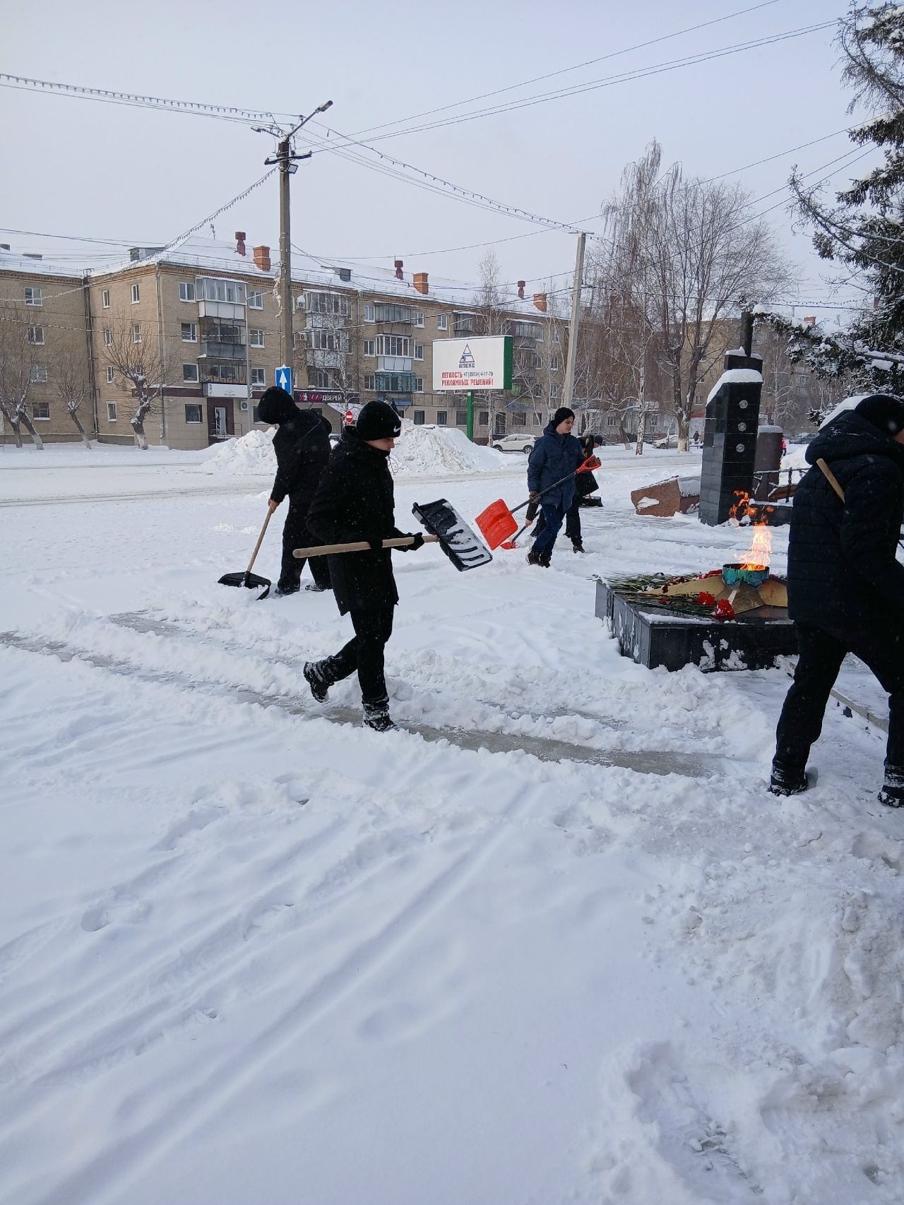 Обильный снегопад засыпал мемориал Победы в Южноуральске. Старшеклассники школы № 6 Южноуральска решили исправить ситуацию.