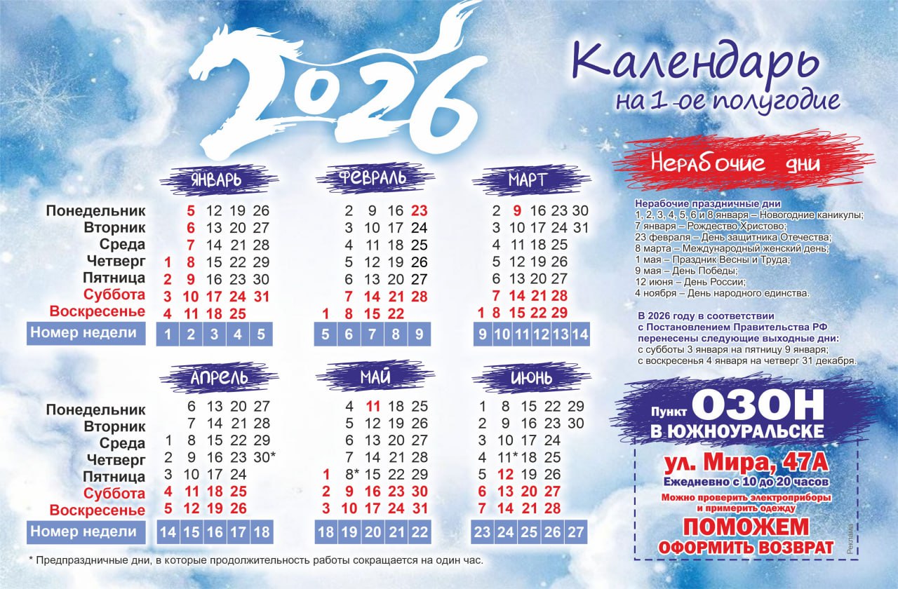 Друзья, сделали календарь на первое полугодие Нового 2026 года.