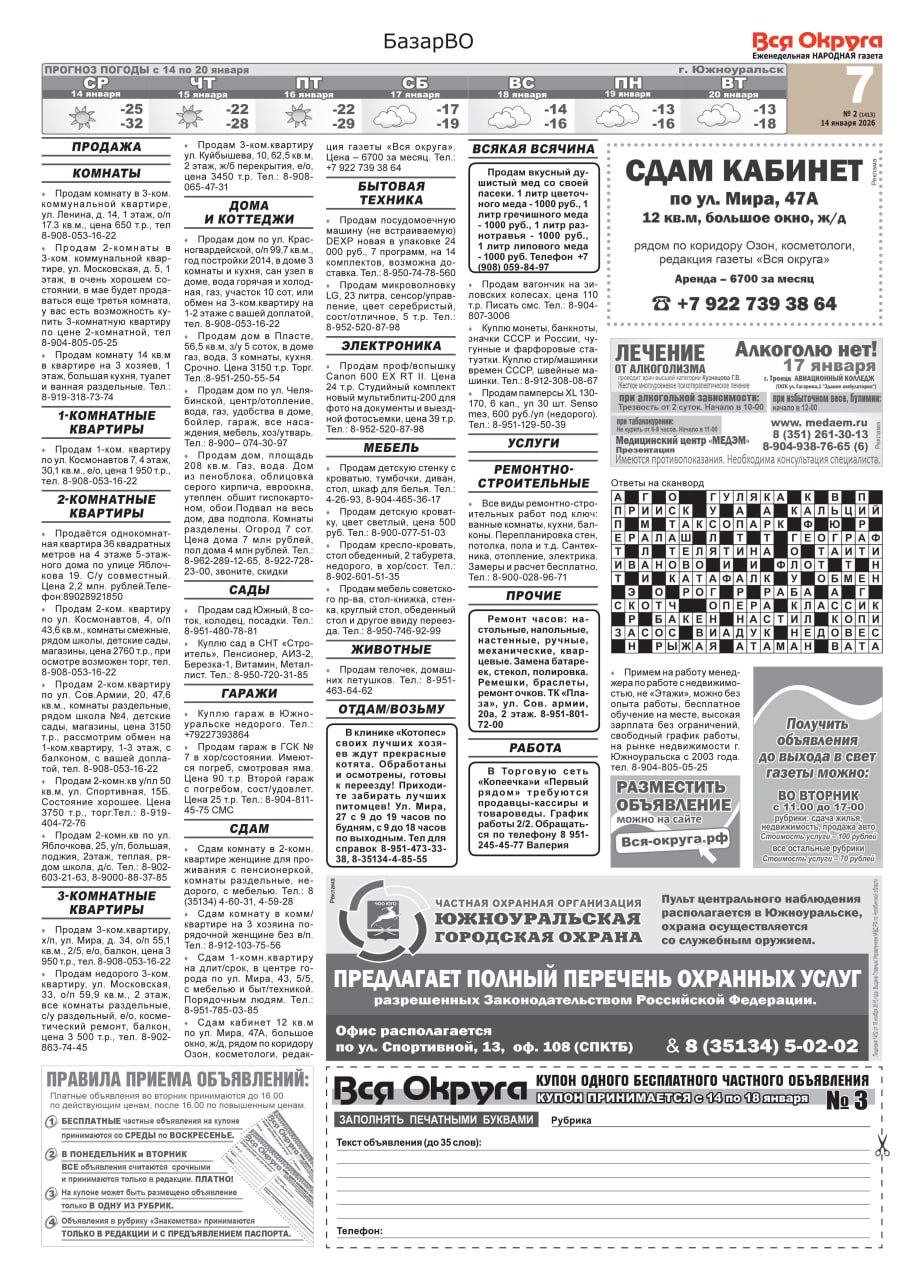 Друзья, публикуем объявления из газеты «Вся округа» от 14 января.