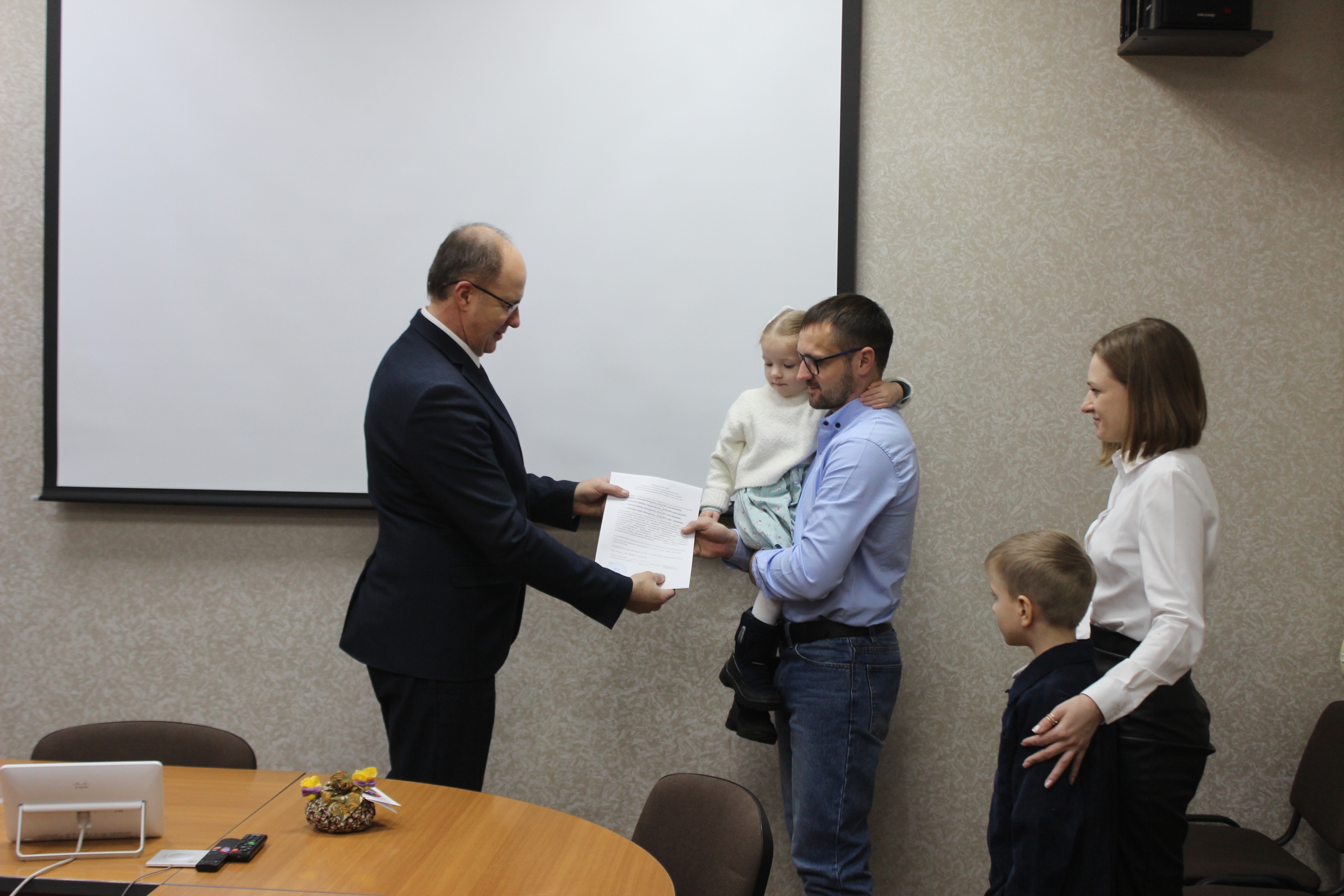 Глава Увельского округа Сергей Рослов 26 февраля вручил свидетельство о праве на получение социальной выплаты на приобретение жилого помещения или строительства молодой семье Дмитрия и Марины Бабкиных.